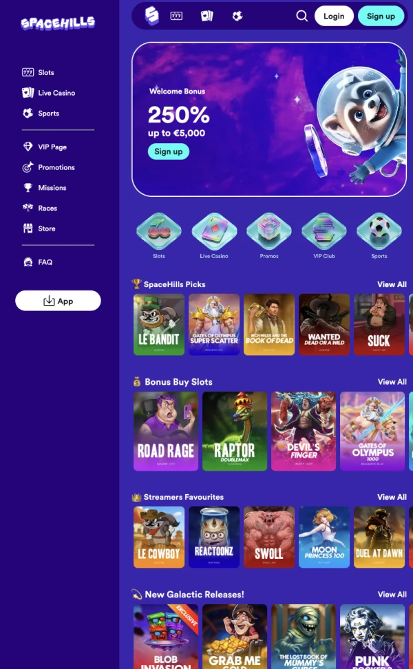 - Vorteile: Starke SpaceHills bonus-Optionen mobil, inklusive 200% bis zu 1.500 EUR plus 100 Freispiele oder 250% bis zu 5.000 EUR für High Roller